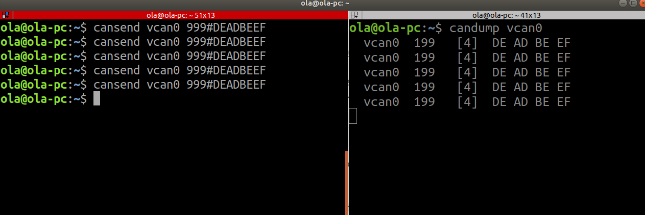 그리고 나머지 한 터미널에서 다음 명령으로 vcan0 인터페이스에서 통신을 전송해보자.